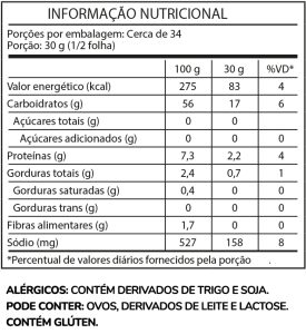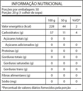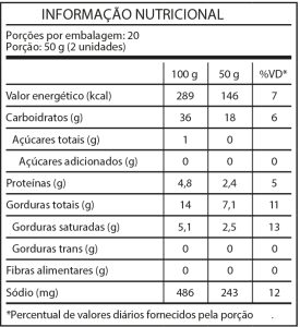 *Valores diários de referência com base em uma dieta de 2.000KCal ou 8.400WJ. Seus valores diários podem variar dependendo de suas necessidades energéticas. **Valores não especificados.